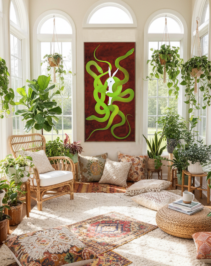 “RABBIT & SNAKES” Oil on canvas, 80 × 160 cm